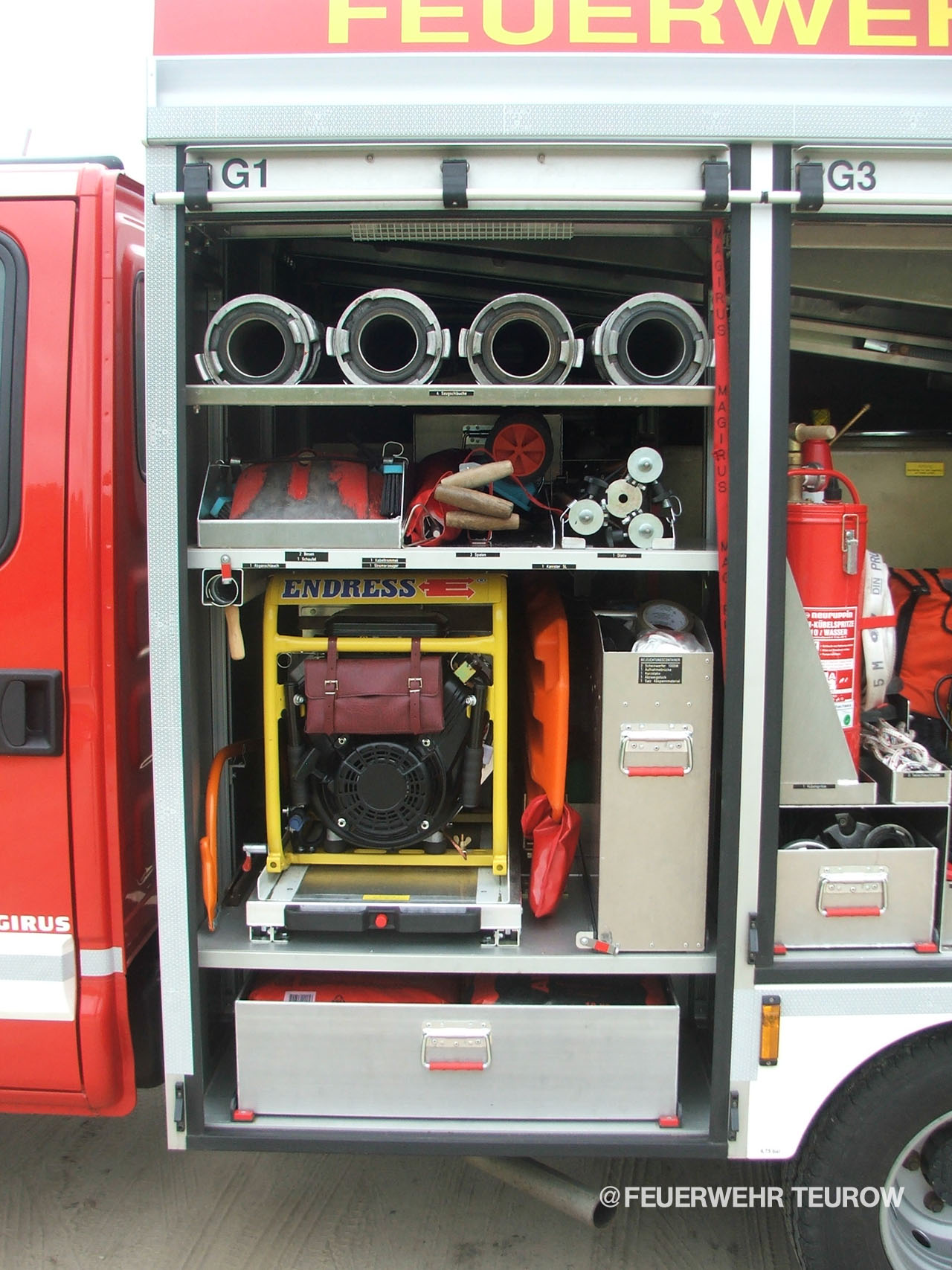 Als das neue TSF-W unser stolze 36 Jahre altes LF8 ablöste, war noch kaum abzusehen, wie umfangreich die Beladung im Laufe der Zeit werden würde. Ausgeliefert mit einer Magirus Fire 1000, übernahm das Fahrzeug zunächst die restliche Ausrüstung fast komplett vom Vorgänger. Seither haben wir die Ausstattung kontinuierlich ergänzt und modernisiert, sodass wir unseren Einsatzwert stetig steigern konnten.